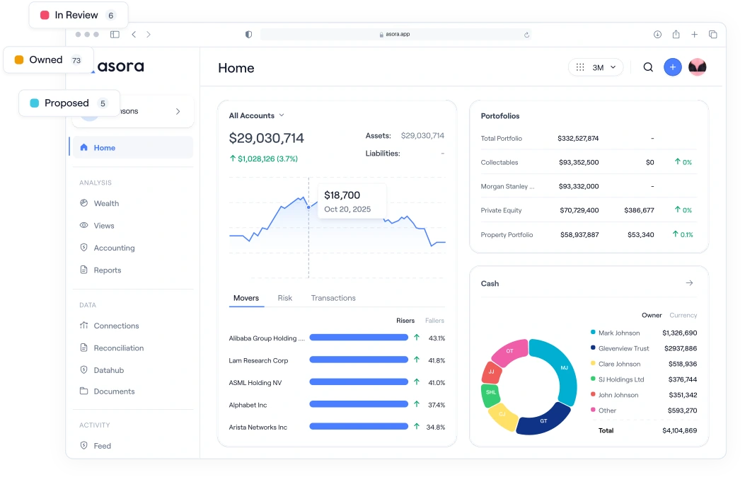 Asora is a family-office operating platform that centralises data aggregation, portfolio management, and reporting in one secure environment. It replaces disconnected spreadsheets, siloed systems, and manual workflows — giving you a single source of truth for all assets, entities, and accounts.
