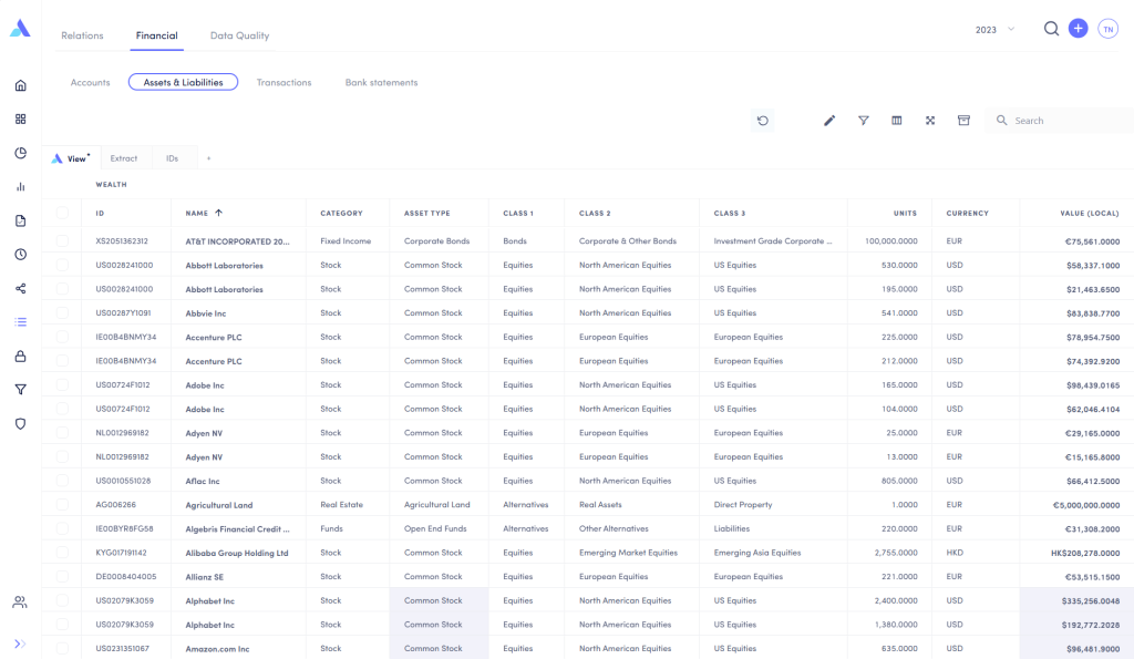 Asora employs sophisticated data mapping techniques to ensure the accuracy and usability of aggregated data. Automated categorisation of asset classes, transactions, and corporate actions simplifies tracking financial information across various providers and asset types.
