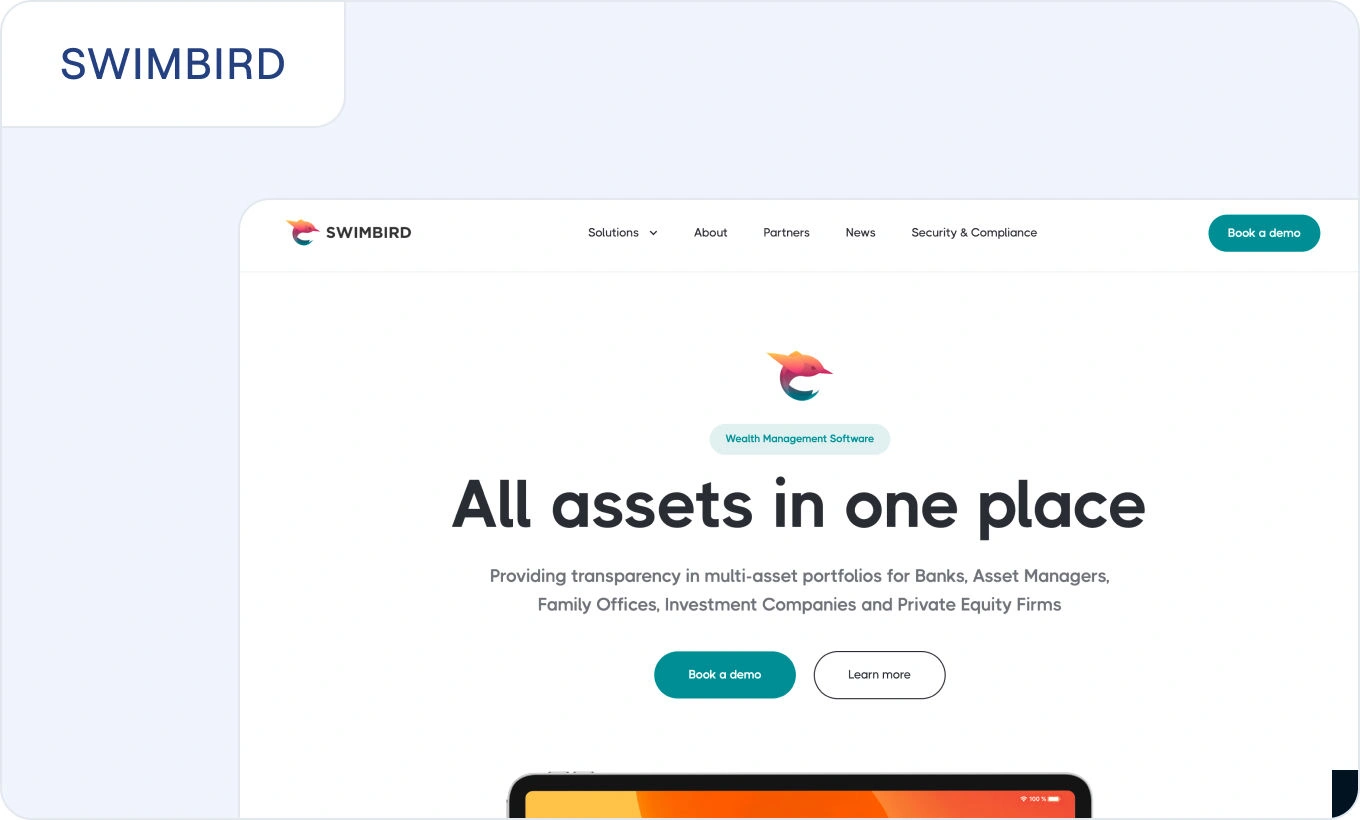 The Swimbird Platform (SWIP) is a portfolio management solution offering users a holistic view of their entire portfolio. SWIP aggregates and visualises portfolio data, including assets and liabilities – all in real time. It can manage all financial instruments (listed and OTC), private equity, and alternative investments.