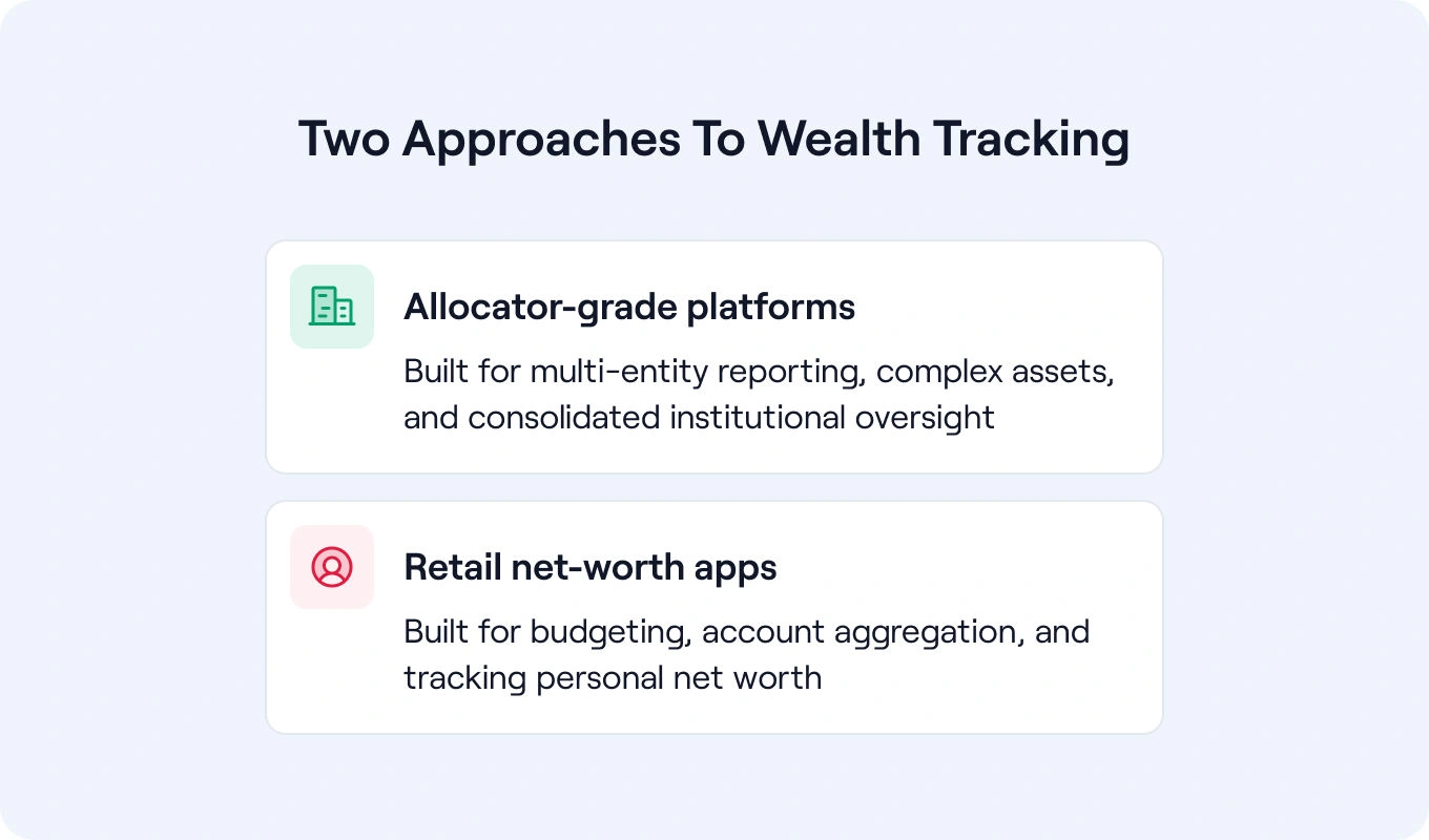 At a high level, wealth tracking tools fall into two categories: family office-grade platforms and retail net worth tracking apps, each serving a different purpose.