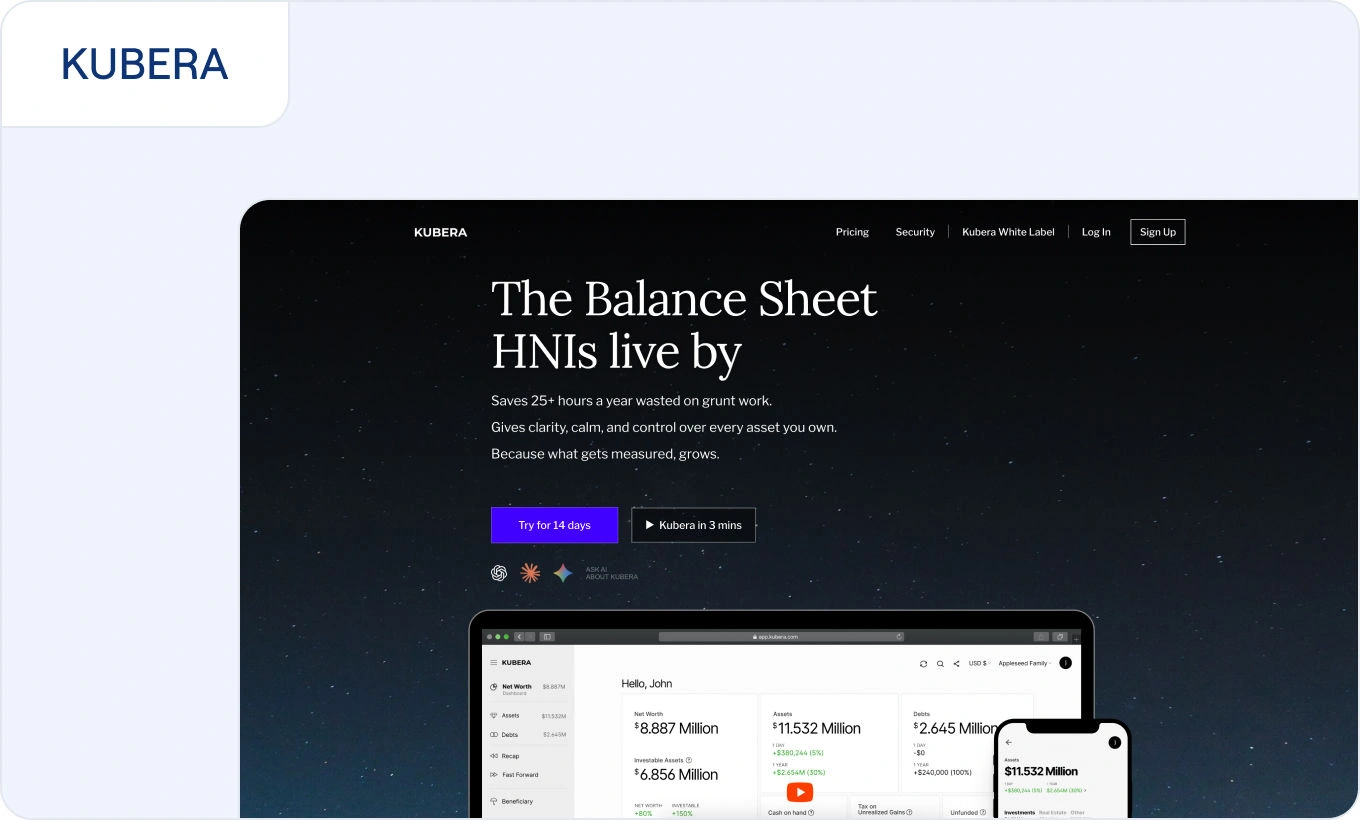 - Comprehensive net worth tracking across all assets and liabilities, including private investments, real estate, operating businesses, loans, and total liabilities, to provide a full picture in a single dashboard.