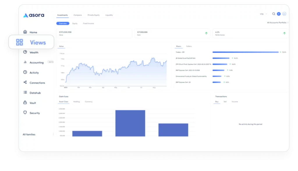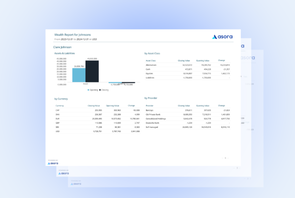 Asora is a consolidated reporting platform for family offices of all sizes. It helps track and oversee assets, automating data capture and providing digital on-demand reporting on the web and mobile. Asora provides a single secure location for all the family’s data, which is protected with always-on encryption and robust security protocols.