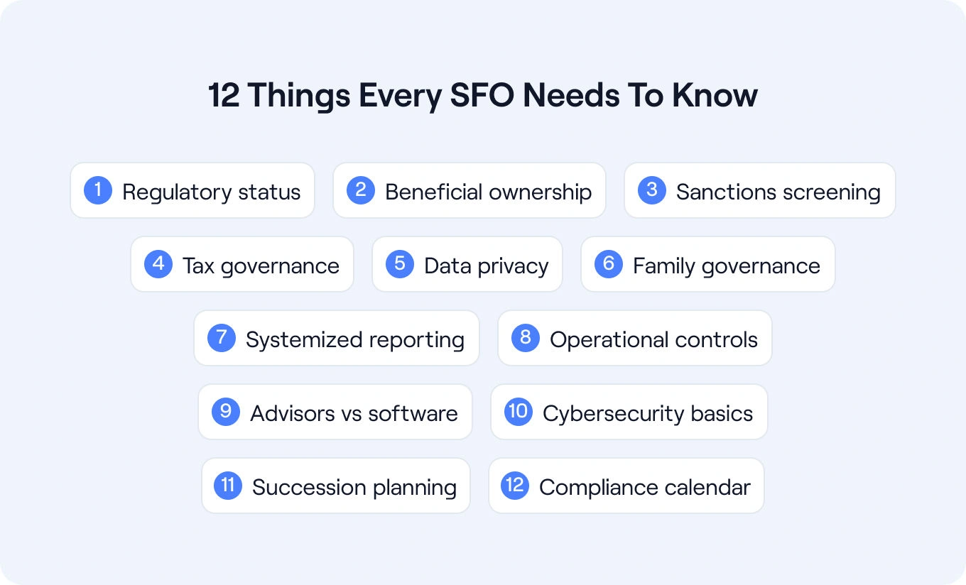 A single family office exists to steward family wealth and align capital with family objectives across multiple generations. Compliance is often viewed as a technical function, yet for an SFO, it is a practical enabler of informed decisions and seamless execution. Regulatory compliance affects how advisory services are delivered, how investment strategies are executed, how sensitive data is protected, and how financial statements are produced. The more entities established under the family umbrella, the more critical it becomes to organize compliance management so the team can meet regulatory obligations without sacrificing speed.