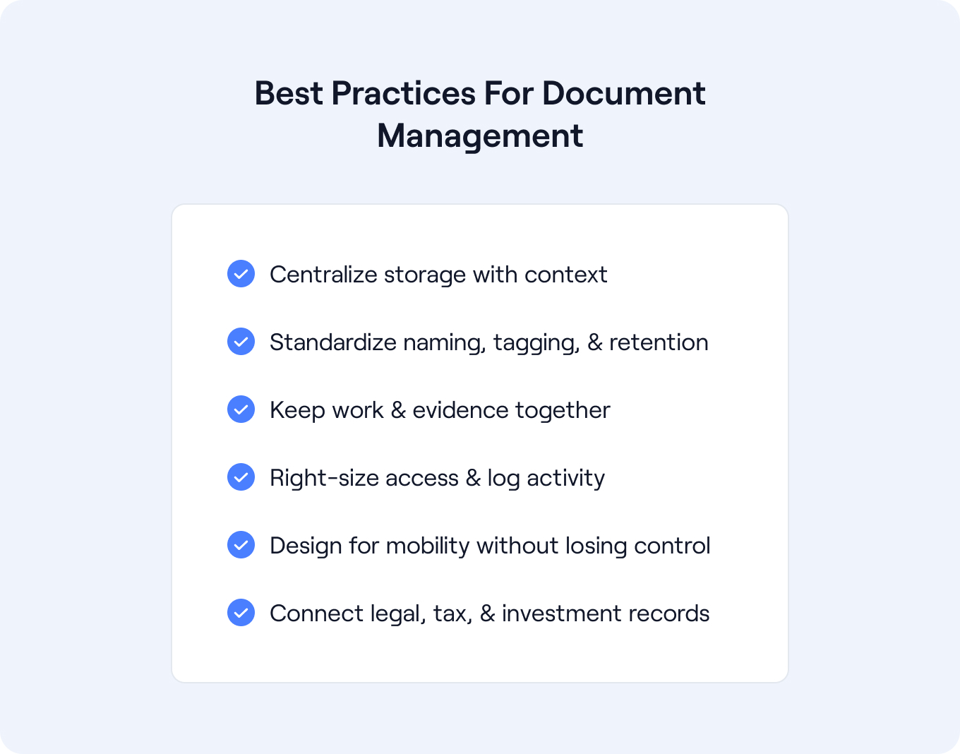 Effective document management underpins audit readiness, facilitates faster closings, and reduces operational risk. The practices below centre on a governed vault tied to your data model, consistent naming and retention, in-context workflows, right-sized access with activity history, secure mobility, and explicit links between legal/tax documents and the calculations they drive.