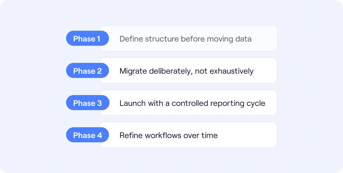 A phased rollout anchored to an upcoming reporting milestone (such as the next quarter-end cycle) typically allows governance, permissions, and document structure to stabilise before full reliance is placed on the system.