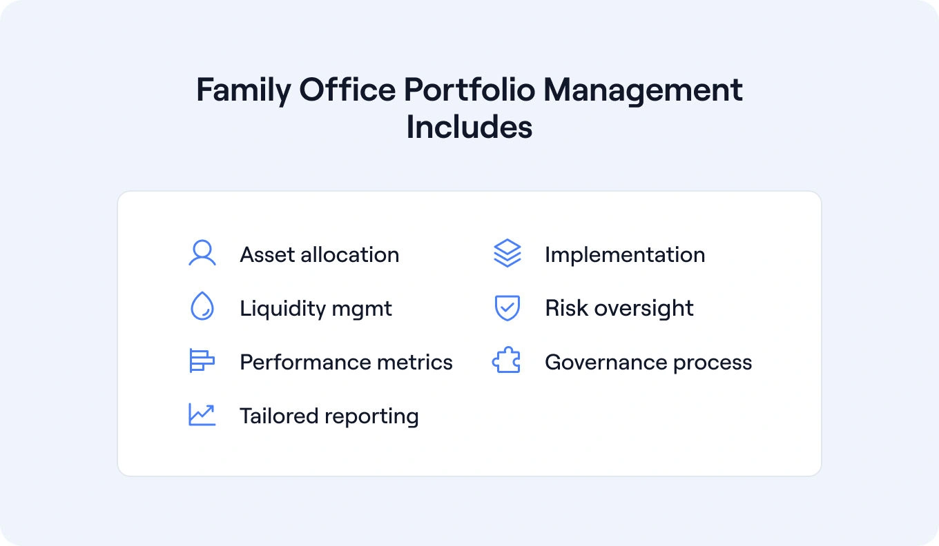 Family office portfolio management encompasses the full cycle of managing family wealth, including setting policy, implementing asset class allocations, monitoring risk and liquidity, measuring performance, maintaining governance, and producing family office portfolio reports that serve various audiences.