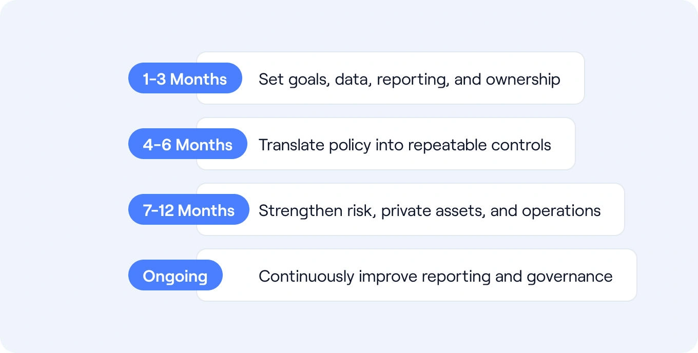 - Develop a private assets playbook for diligence, pacing, and tracking