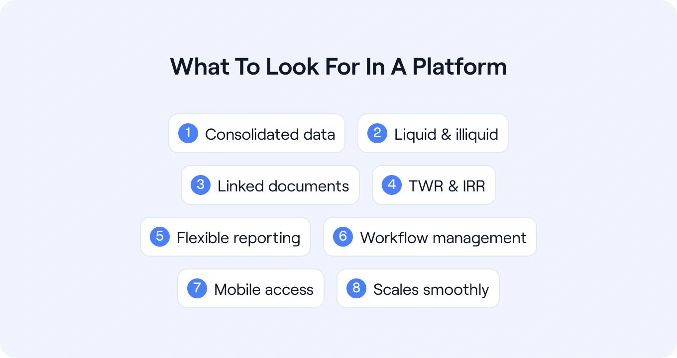 - Platform: The technology that consolidates portfolio data, links documents to holdings, tracks workflows, and enables reporting. For lean single family offices, this needs to work without a large IT team.