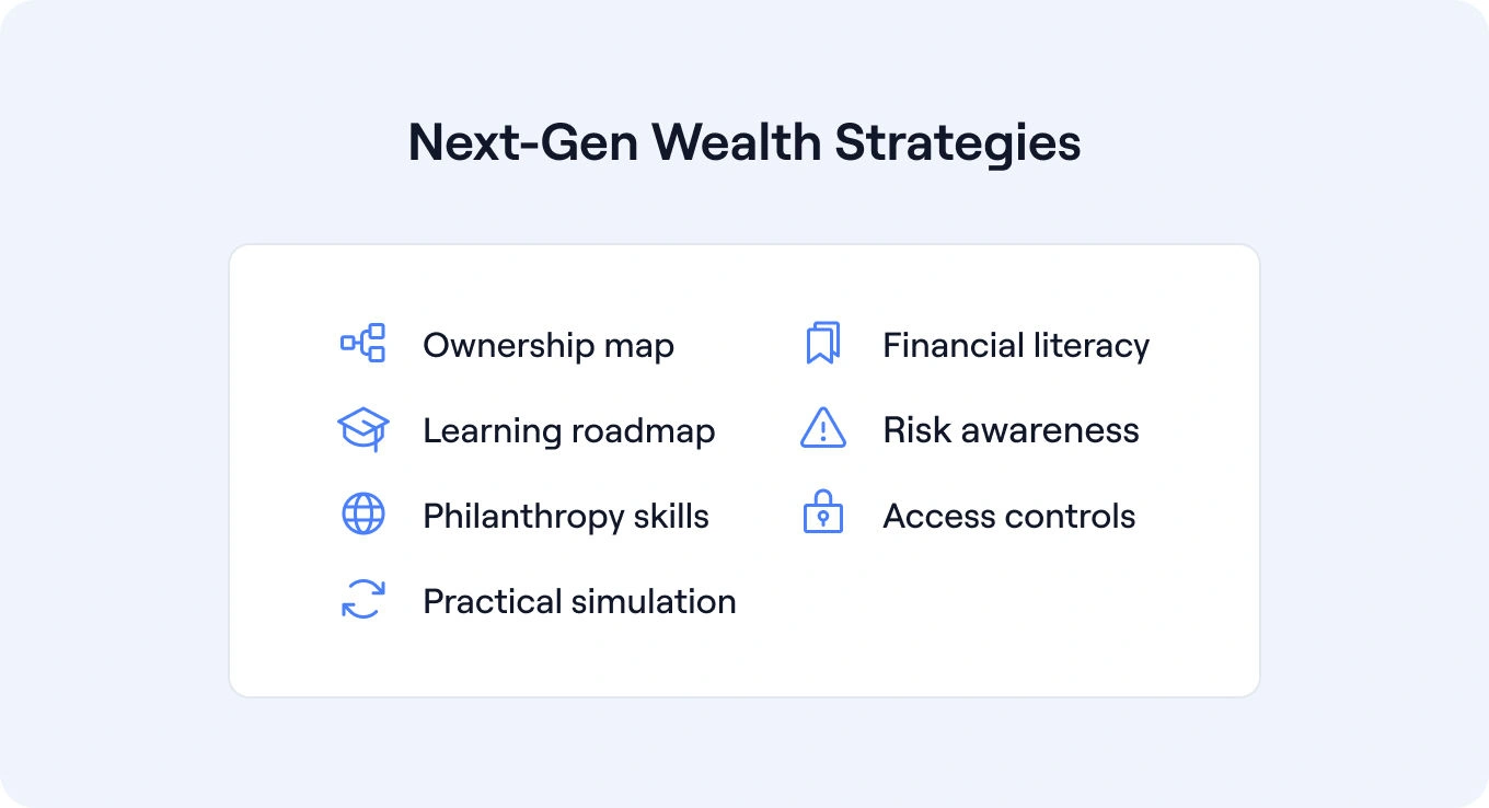 Family wealth education prepares the rising generation to understand the structures and responsibilities they'll inherit. This guide covers seven practical strategies: mapping ownership, learning from real documents, creating a living learning plan, using small decisions to teach big principles, building philanthropy modules, teaching security basics, and running simulations.