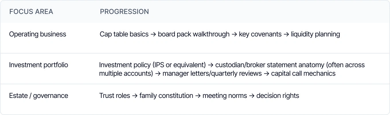 The goal isn't to create mini-CFOs. It's to build informed confidence so the next generation can participate meaningfully in family governance, ask good questions, and eventually take on real responsibility.