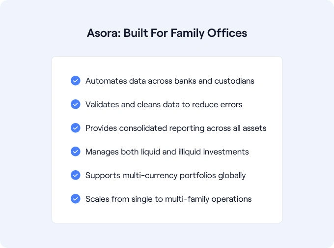 Asora was built because family offices were struggling with these exact issues. They had tools that were either too simple or too complex to use.