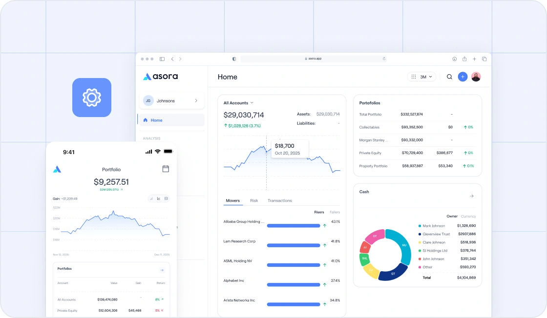 • Consolidated tracking: Asora's platform tracks both direct property ownership and fund investments in one place, showing total real estate exposure across the family office portfolio.