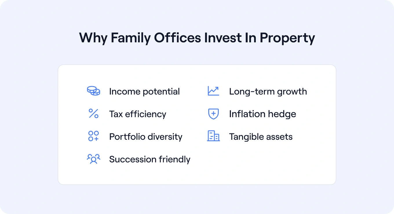 Real estate is a common allocation for many family offices, particularly those seeking income, diversification, and long-term capital preservation. Public markets are abstract, but real estate provides tangible assets families can see, touch, and pass down through multiple generations. It may generate rental income and may appreciate over time. Tax outcomes and diversification benefits vary by jurisdiction, structure (direct vs fund vs REIT), and market conditions.