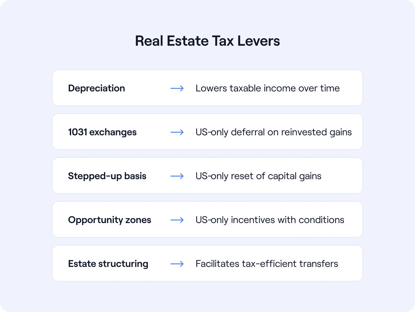 The tax characteristics of real estate can improve after-tax outcomes, but they’re not guaranteed. Benefits vary by jurisdiction, structure, holding period, and investor profile, and may be offset by fees, leverage limits, depreciation recapture, and compliance complexity. Framing: “potential tax efficiency with trade-offs,” not “automatic tax advantage.”