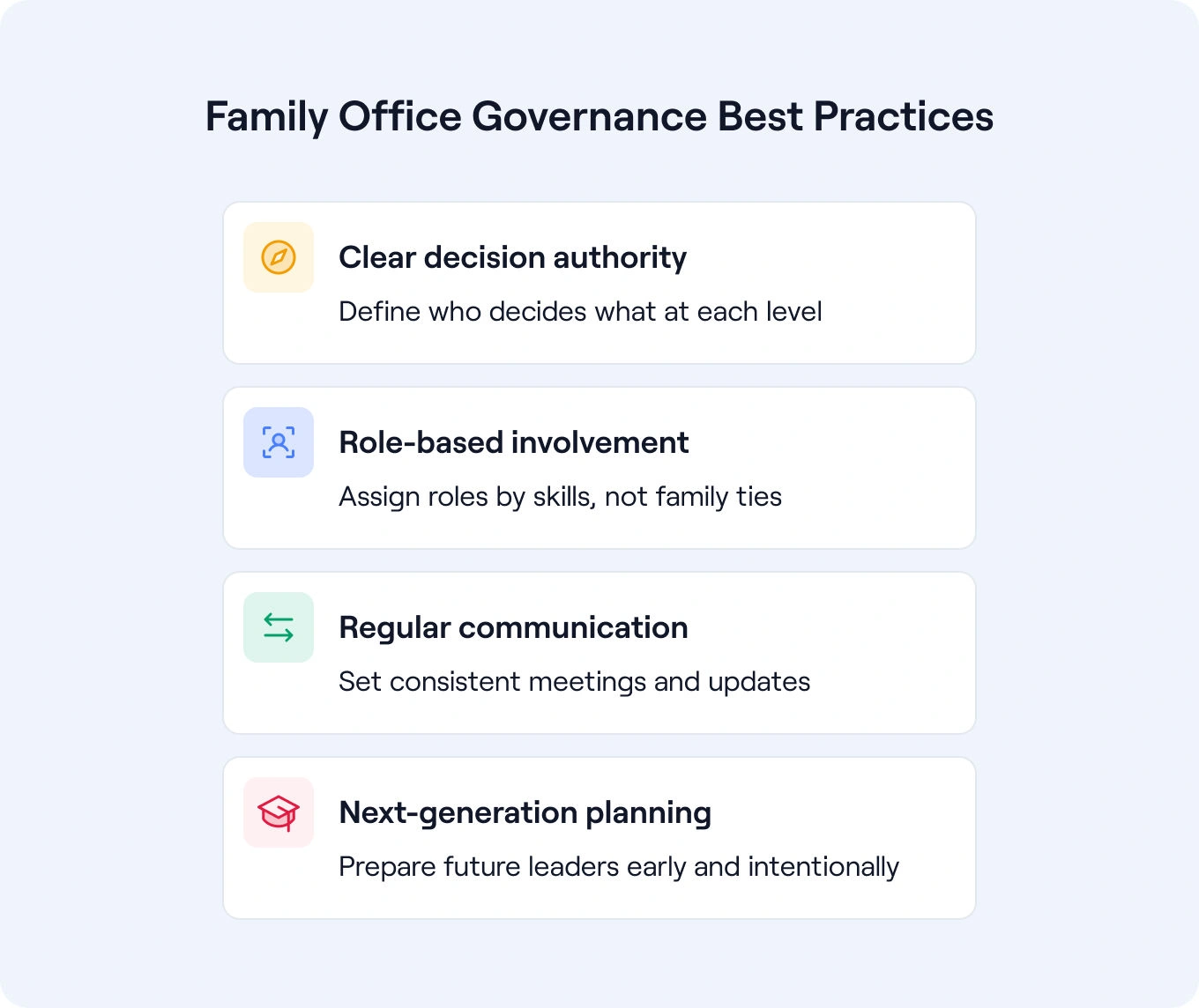Poor communication kills more family offices than poor investment performance. Establish regular rhythms that keep everyone informed and engaged: