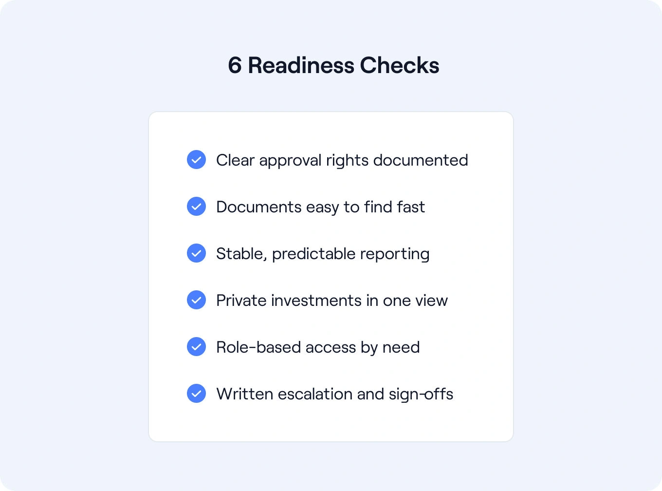 - Document map: If you needed an LPA, side letter, or valuation report right now, could your heirs locate it in under five minutes?