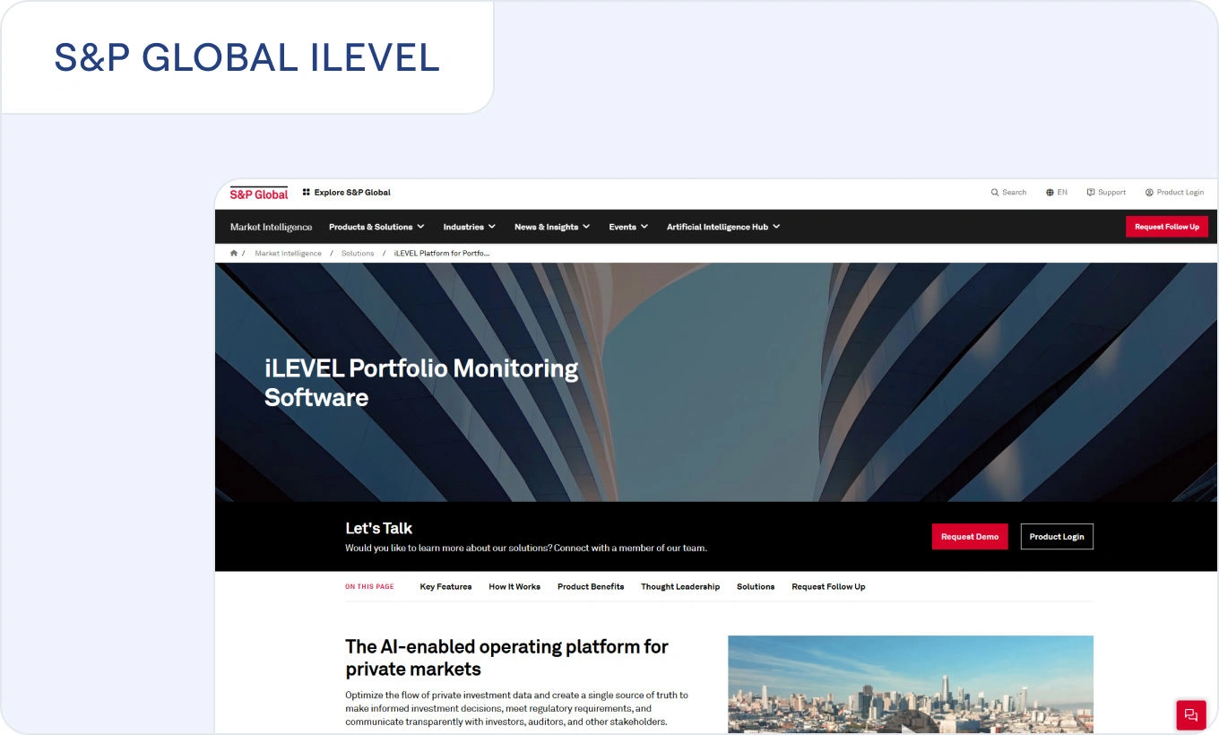 S&P Global iLEVEL is a private markets data management and portfolio monitoring platform used by GPs and LPs to streamline data collection, analytics, valuation, and reporting.