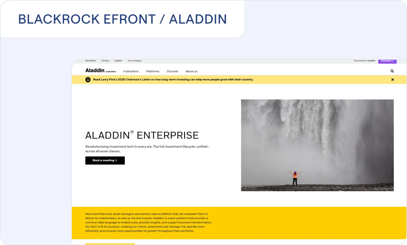 BlackRock eFront, within the broader Aladdin ecosystem, provides private markets capabilities alongside wider Aladdin portfolio and risk workflows.