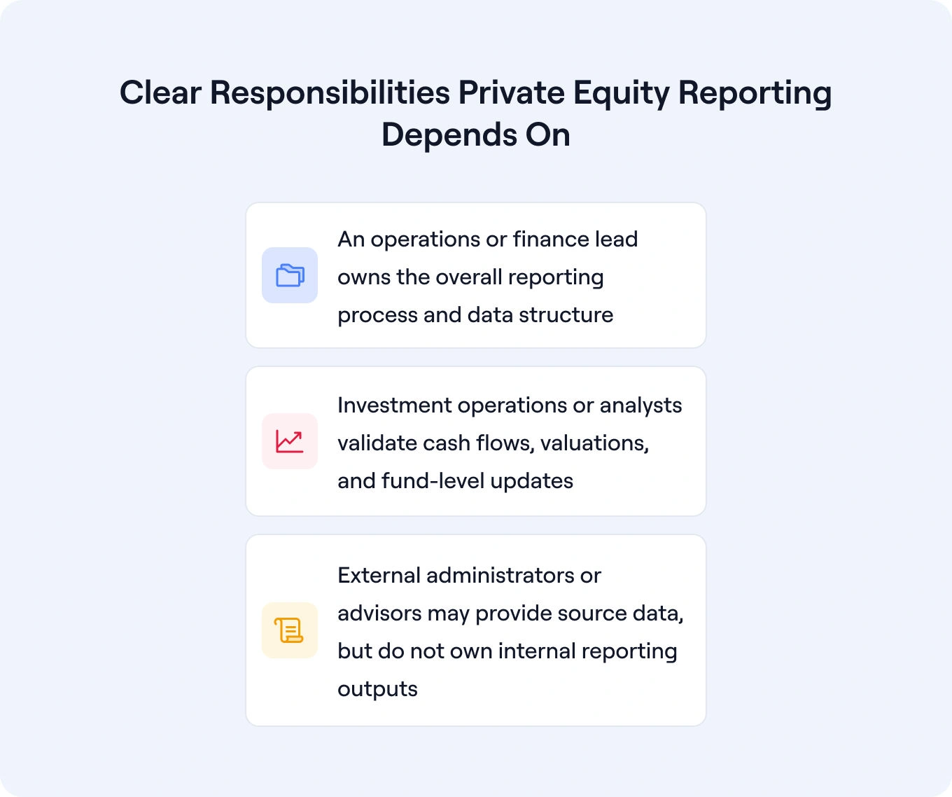 Just as important as the steps themselves is internal ownership. Private equity reporting does not run on software alone; it depends on clear responsibility across the team. In most family offices and lean investment teams, this typically means: