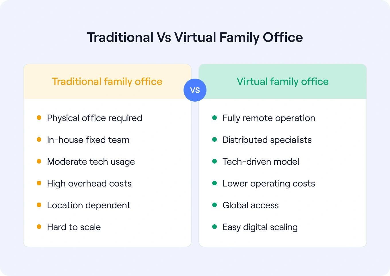 - Flexibility: Virtual family office structure allows for greater geographic flexibility and easier scaling of services compared to traditional single family office operations.