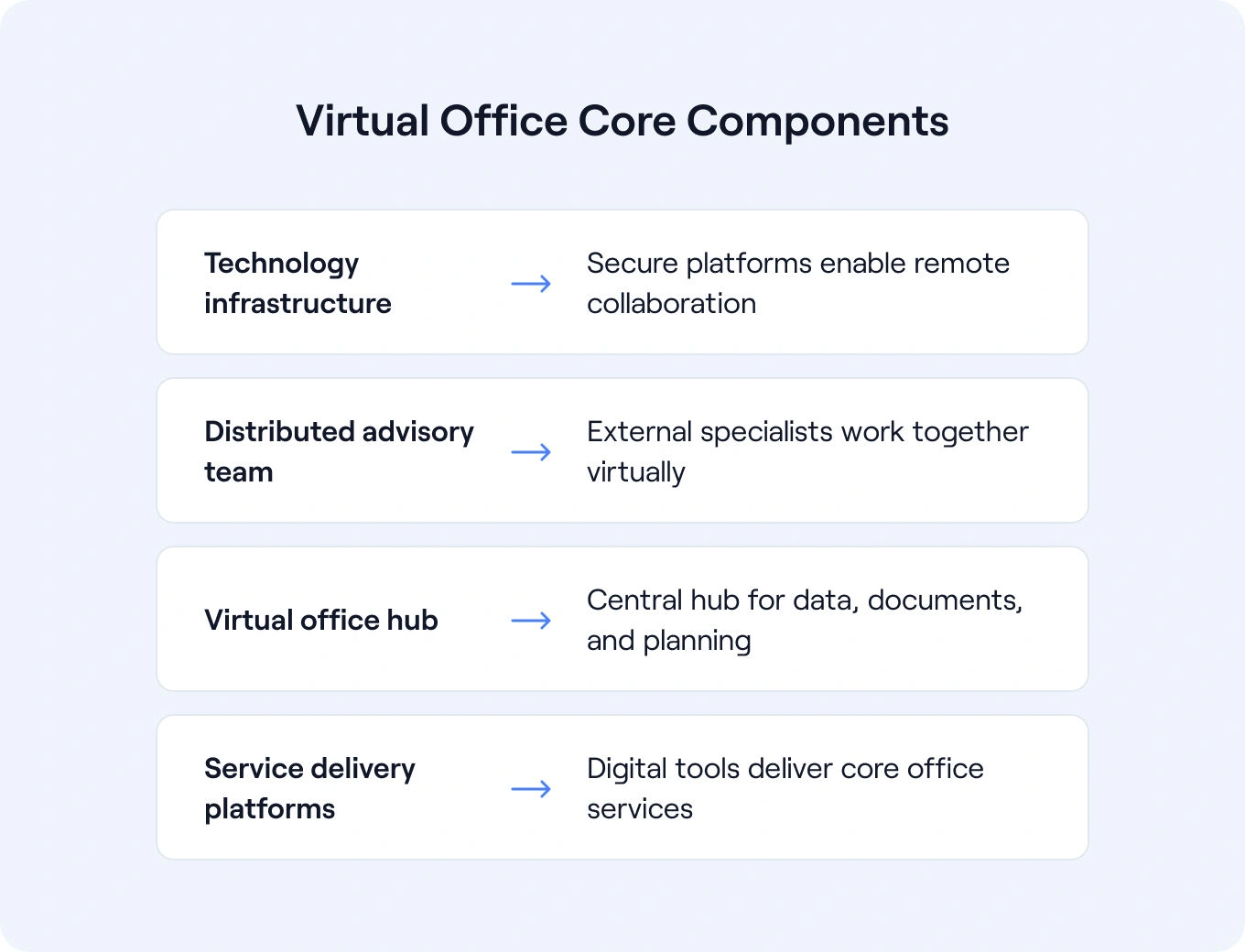 - Service Delivery Platforms: Modern virtual offices utilize sophisticated platforms that enable seamless delivery of core services including investment management, financial reporting, tax planning, and family governance support.