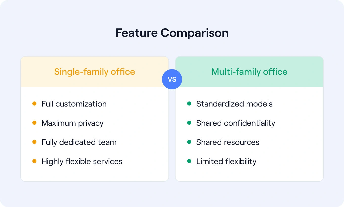 Single-Family Office: Dedicates all resources to one family, providing highly customized services but requiring higher net worth thresholds (typically $100–500 million) to justify operational costs.