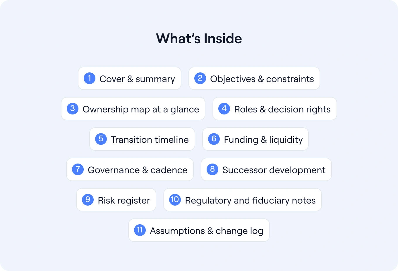 A useful family business succession planning template should separate the major parts of succession clearly so families can see what is changing, what needs validation, and who is involved.