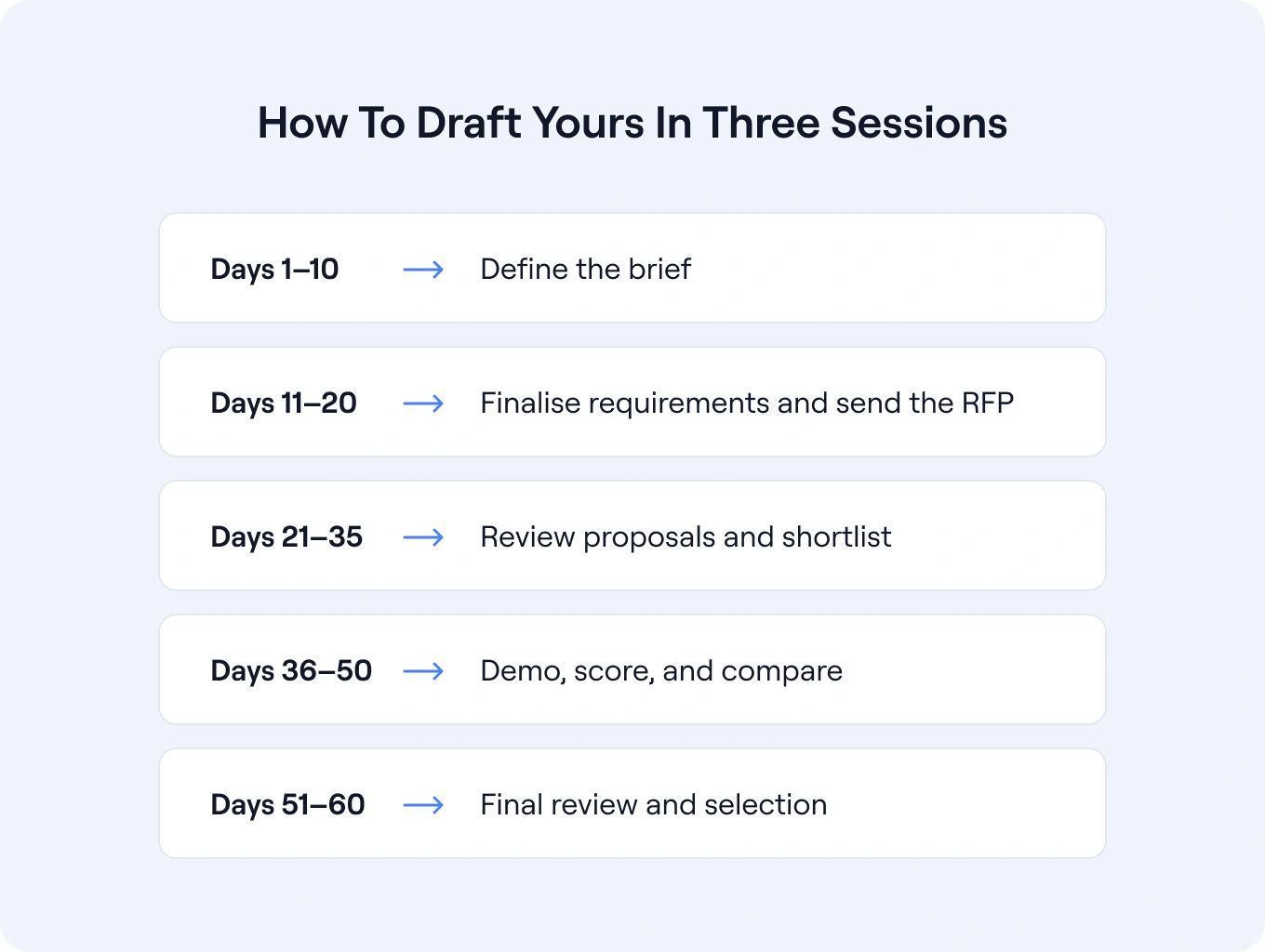 Collect responses, flag gaps, schedule follow-up questions, and shortlist vendors for deeper review. This is the stage where a consistent proposal structure makes a big difference.
