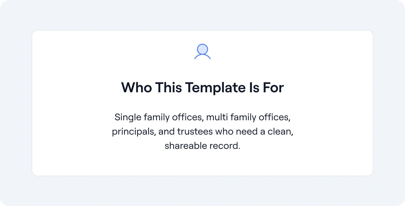 Families need a defensible, decision-ready view of money, assets, and debt. This net worth template creates a clear balance sheet with documented assumptions that works across public markets, private funds, real estate, and operating interests.