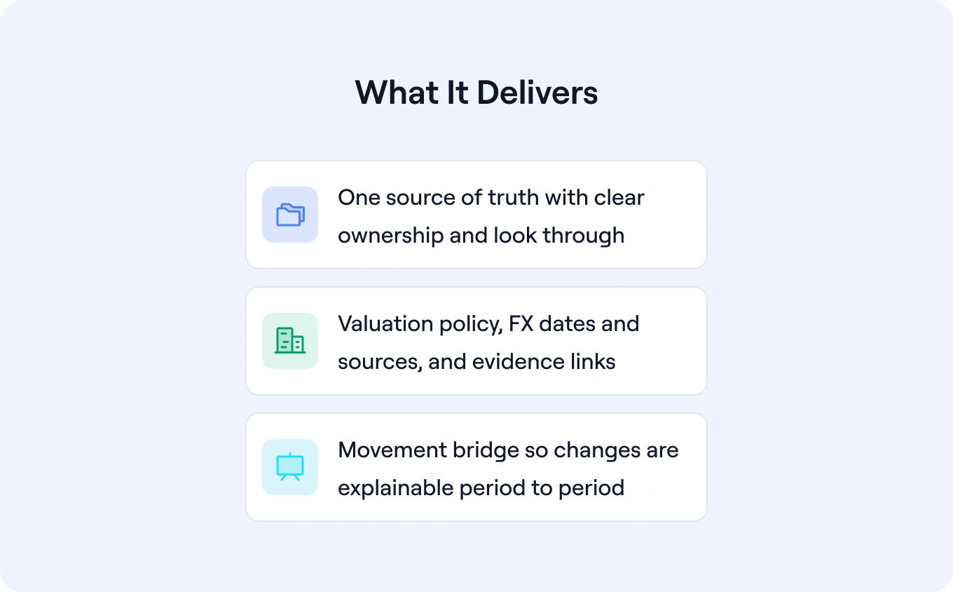 Use this as a quick quality test. In a family office context, good means a clear, reconciled, and governed record that covers ownership and look-through, valuation and FX, liabilities and collateral, version control, confidentiality and sign off, an evidence index, and recourse treatment.