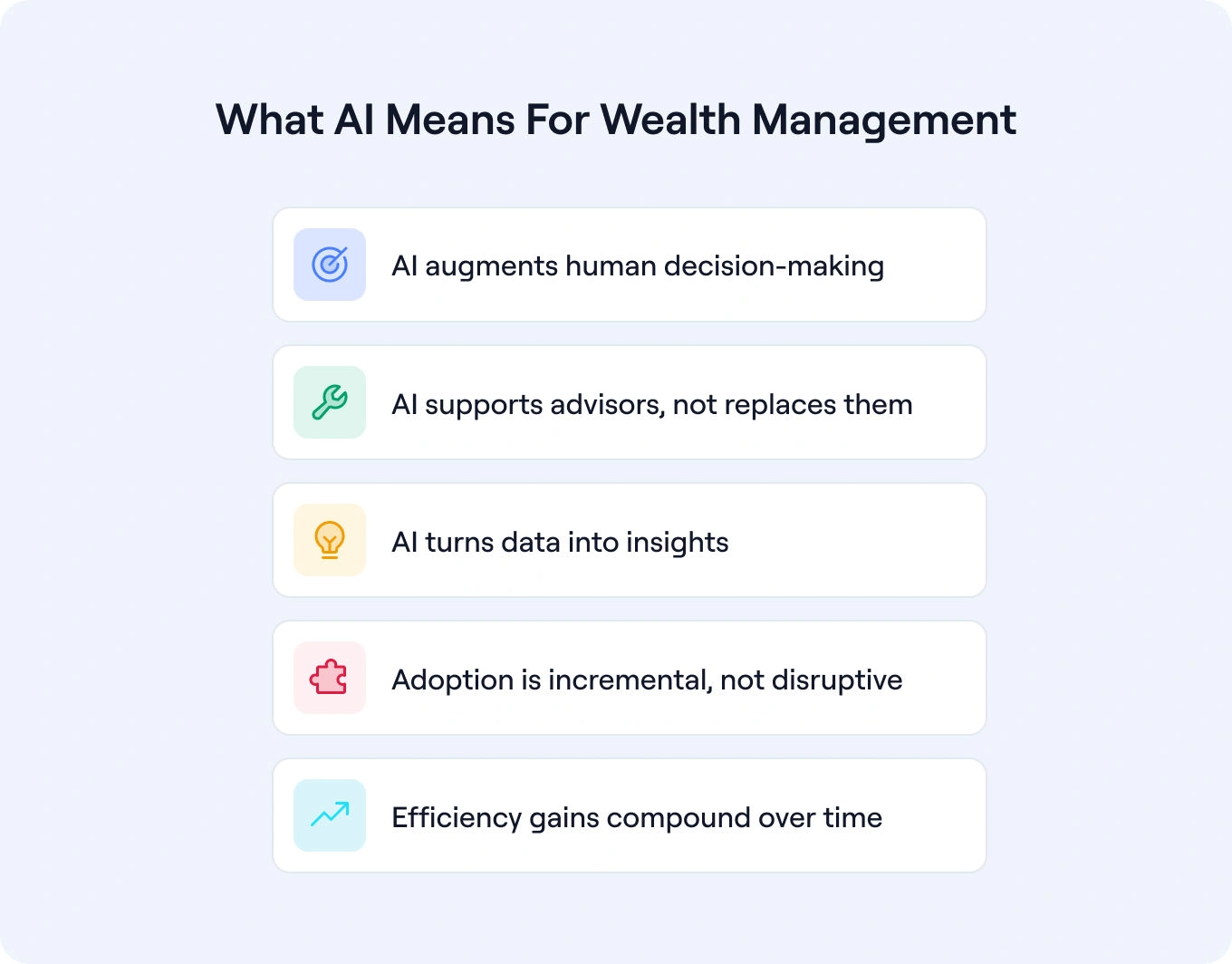 This pragmatic approach to AI and wealth management adoption allows wealth management firms to begin implementing AI solutions incrementally. This leads to operational efficiency gains that compound over time.